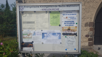 Der Schaukasten links neben dem Eingang erzählt von einem fröhlichen Gemeindeleben für alle Altersgruppen und dem Engagement des großen Bläserchores, der gerade sein 50jähriges Bestehen begeht.
