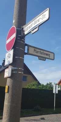 Pfarrhufenweg heißt die Straße links neben der Kirche und weist so den Blick in die Jahre des Baus der Kirche, in denen rings herum noch Acker war, unter anderem Felder, die einst für die Versorgung des Mahlsdorfer Pfarrers und die Unterhaltung der Dorfkirche bestimmt waren. Wie viel Land eine „Hufe“ nach heutigen Maßstäben war, so erfährt man bei Wikipedia, das war sehr unterschiedlich je nach Gegend. Auf jeden Fall ist dieses Land heute als Bauland eine ganze Menge Wert, wodurch die Gemeinde zu denjenigen im Kirchenkreis gehört, die andere, ärmere Gemeinden kräftig finanziell unterstützen.