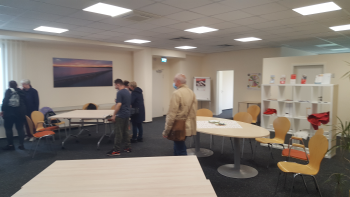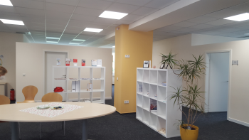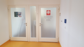 Hinter dieser Tür empfängt uns ein großer heller Raum, von dem aus die einzelnen Büros zu erreichen sind und für Besucher Info-Material ausliegt.