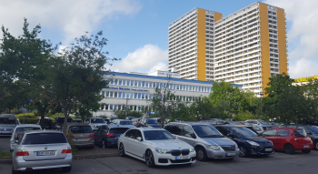 Von der Straßenbahn kommend liegt das Gesundheitszentrum hinter dem großen Parkplatz.