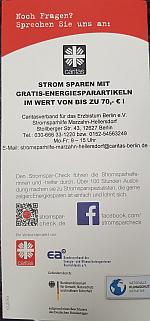 Wir erfahren, dass im Haus seit letzter Woche auch der Caritas-Migrationssozialdienst, der bisher in der Allee der Kosmonauten zu finden war, zu Hause ist, außerdem die Ambulante Wohnungslosenhilfe und die Stromsparberatung für Haushalte mit geringem Einkommen. So sind nun vier Dienste des Caritasverbandes für das Erzbistums Berlin e.V. am Helene-Weigel-Platz 10 zu finden, was auch die Zusammenarbeit untereinander erleichtern wird.