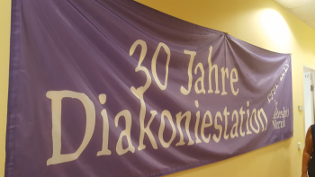 Ein großes Banner erzählt von dem 30jährigen Bestehen der (beiden) Diakoniestationen, die 1991 sowohl in Marzahn wie in Hellersdorf durch die maßgebliche Initiative der dortigen Pfarrer