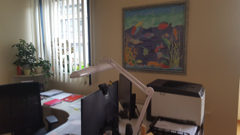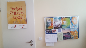 Freundlich sieht es auch in den Büros aus, wie hier in dem von Uta Richter. - So sammelt sie hier die Losungen der letzten Jahre an ihrem Wandbrett.