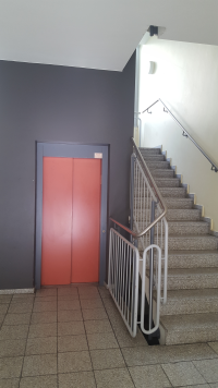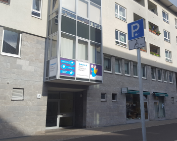 Wo ist die Nummer 8 der Kokoschkastraße, die links und rechts von der Louis-Lewin-Straße abzweigt? Zum Glück steht der Hinweis auf die Diakoniestation groß über dem Hauseingang. Dort fährt man entweder mit dem Fahrstuhl in die 1. Etage oder nutzt die Treppe.