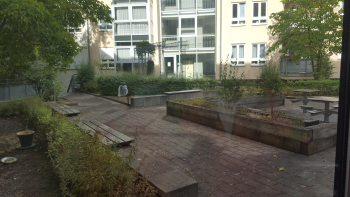 Rechts davon erlauben Glastür und großes Fenster einen Blick in den Innenhof, der zur Erholung und zum Luftschnappen einlädt.