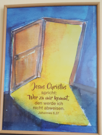 An der Tür steht das Wort Jesu aus der Bergpredigt Matthäus 6.20a: „Sammelt Euch aber Schätze im Himmel“ - (und nicht auf der Erde). In einem gemeinnützigen Unternehmen ist das so. Wichtig ist, dass sich die Kunden wohlfühlen und lange in ihrer Häuslichkeit bleiben können. Aber auch die Mitarbeitenden sollen ein angenehmes Arbeitsklima vorfinden. Wir nennen die Namen von Mitarbeitenden, die wir noch aus der Zeit der Station in Marzahn kennen. Viele sind natürlich nach 30 Jahren inzwischen im Ruhestand, aber einige sind immer noch dabei – ein gutes Zeichen für das Arbeitsklima. Doch ist das Durchschnittsalter der Pflegenden über 50 und neue, jüngere Mitarbeitende werden immer wieder gebraucht.