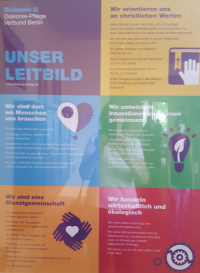 Im großen Foyer empfangen uns freundliche Farben, Flyer zum Mitnehmen. An der Wand hängt das Leitbild des Diakonie-Pflege Verbundes aus. Das Leitbild wird jedem neuen Mitarbeitenden in der Einarbeitung vermittelt.