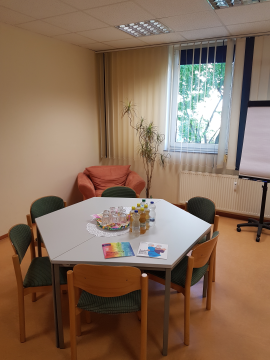 Wir nehmen in diesem Mitarbeiterraum Platz, wo Getränke auf uns warten und die Pflegedienstleiterin der Station Uta Richter uns über ihre Arbeit berichtet und uns anschließend durch die Station führt.