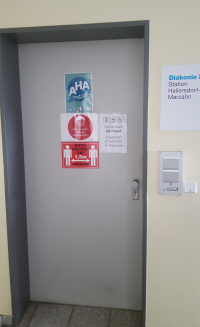 Dann ist die Eingangstür gleich zu sehen – mit Hinweisen auf die Einhaltung der Corona-Regeln.