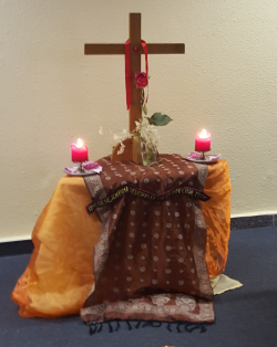Blickfang im Raum ist das geschmückte Kreuz und der Altar, der mit einem Spruchband geschmückt ist, auf dem steht: „Siehe ich bin bei euch alle Tage, bis an der Welt Ende“ - den letzten Worten Jesu zu seinen Jüngern nach dem Matthäus-Evangelium, nachdem sie die Auftrag bekommen hatten, zu allen Völkern zu gehen.