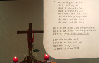Gläubigen aus mehreren Völkern begegnen wir auch hier beim Lobpreis und Gebet. Die Texte der Lobpreislieder sind für alle an der Wand zu lesen, die Melodien sind eingängig und durch Wiederholung können wir schnell mitsingen.