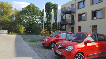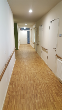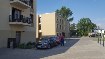 Bevor wir gehen, noch ein Blick auf die beiden Elektroautos des Ambulanten Pflegedienstes, der sich auch im Haus Matthäus befindet und sich auf die nähere Umgebung von Mahlsdorf konzentriert. So nutzen die Mitarbeitenden auch Fahrräder, leisten ihren Dienst also „klimaneutral“: Auch beim Bau aller Häuser wurde auf das Prinzip der Nachhaltigkeit großer Wert gelegt, so z.B. durch ein Lüftungssystem, zentrale Pelletheizung und weitere ökologische Gesichtspunkte wie die Holzfußböden.