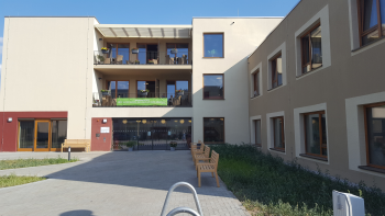 Zwei der Zimmer sind für Gäste bestimmt, für Angehörige, die hier übernachten können, äußerlich gut sichtbar als die weißen Anbauten rechts und links am Haus Markus – ein Zeichen, dass auch an sie beim Bau gedacht wurde.