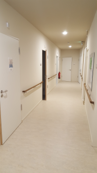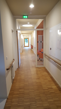 Die Zimmer können wir verständlicherweise nicht betreten, aber ein Blick auf den Flur lässt die freundliche lebensbejahende Atmosphäre spüren. Auch Sterben gehört zum Leben und erzählt vom Leben, wie wir es uns wünschen, von unserer Hoffnung als Christen. Der Pflegedienstleiter Herr Blessin, der uns in seiner herzlichen, fröhlichen Art durch das Haus führt, ließ uns das spüren und sprach es immer wieder aus.
