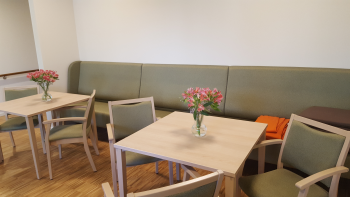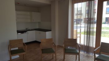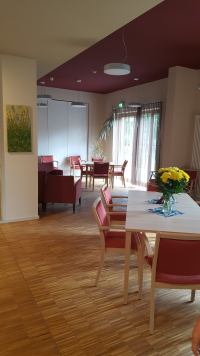 Als nächstes besichtigen wir das Haus Lukas mit der Tagesstätte. Das Foto gibt es leider nicht wieder: Auch dieser Raum ist hell und freundlich mit dem Blick ins Grüne. Die großen Sessel laden zum Ruhen ein. Für ganz Müde gibt es auch eine Schlafgelegenheit.