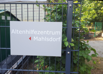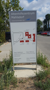 Auf dem Gelände des Altenhilfezentrums angekommen empfängt uns gleich dieser Aufsteller zur weiteren Orientierung.