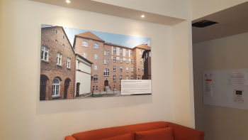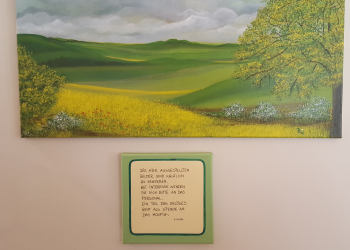 Wie überall demnächst im Altenhilfezentrum schmücken Bilder von Künstlern die Wände, die, wie dieses Schild unter dem Bild ausführt, auch käuflich erworben werden können, wobei ein Teil des Erlöses der Einrichtung zukommt.