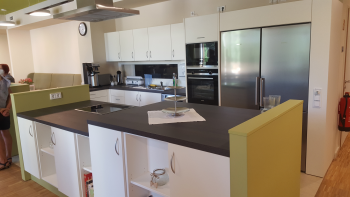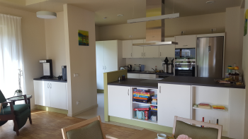 Die Küche ist auch hier in den Aufenthaltsraum integriert und ermöglicht, selbst zu kochen und zu backen.