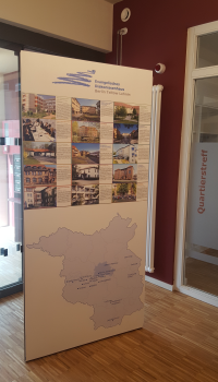 Vor dem Eingang zum Quartierstreff steht ein Aufsteller zu den weiteren Einrichtungen des Diakonissenhauses Berlin-Teltow-Lehnin.. Teil des Diakonissenhauses ist die „Evangelische Altenhilfe Berlin Brandenburg“, die wiederum Träger des hiesigen Altenhilfezentrums ist.