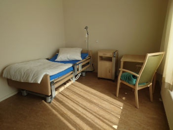 und hier ein Blick in ein Zimmer. Es ist auf der gegenüberliegenden Wand mit einem Kleiderschrank auch noch Platz zum Mitbringen eines eigenen Möbelstücks.