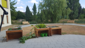 Die großen Fenster geben den Blick ins Grüne frei. Auch wenn die Außenanlage erst noch im Herbst durch das Pflanzen von Bäumen und Rabatten gestaltet werden wird, stehen jetzt schon auf der Terrasse diese Hochbeete für die „eigene“ Ernte bereit.