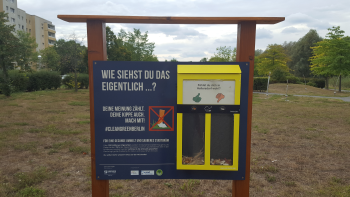 Unten empfängt einen dieser Aufsteller, an dem man mit seiner Zigarettenkippe abstimmen kann, ob Hellersdorf einem gefällt.