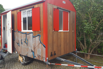 Erst heute Vormittag ist der Bauwagen vom Gelände der Kirchengemeinde hierher gebracht worden, wo er nun 6 Wochen stehen soll. Er wurde mit Fördermitteln des Senats 2019 angeschafft und soll dazu dienen, auch bei schlechterem Wetter zum Kaffee einzuladen. Aber es hat sich gezeigt, dass dann nur sehr wenige den Schritt über die Schwelle wagen.