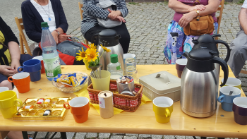 Auch für uns stehen Kaffee und Getränke bereit. Als wir nach der Finanzierung fragen, erfahren wir, dass die Gemeinde die Kosten für die Getränke übernimmt, auch kocht Frau Jungnickel den Kaffee dort.