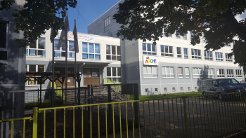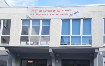 Über dem Eingang des ehemaligen Schulgebäudes sind Jesu Worte an seine Jünger zu lesen: „Lasst die Kinder zu mir kommen und hindert sie nicht daran!“ aus Matth. 19,14.