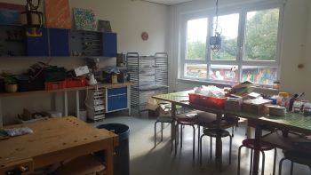 Hier stehen vielfältige Materialien zum Gestalten für die Kinder bereit.