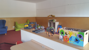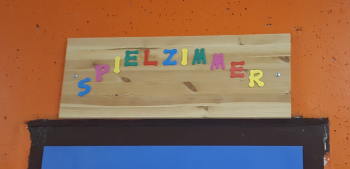 Das Spielzimmer bietet viel Raum zur Bewegung, auch einen großen Bällepool hier gegenüber zum „Baden“.