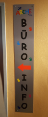 Als wir uns im Büro melden, dass wir als Pilgergruppe da sind, fällt uns der so farbenfroh und einladend gestaltete Türhinweis auf.