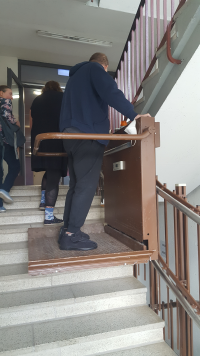 Wir wurden eingeladen in der 2. Etage im Hertha-Raum Platz zu nehmen. Da wir Gehbehinderte unter uns hatten, wurde als Fahrstuhl – ein Treppenlift herangeholt und genutzt.