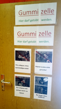 Im Raum schräg gegenüber die „Gummizelle“, Die Regeln stehen an der Tür geschrieben.
