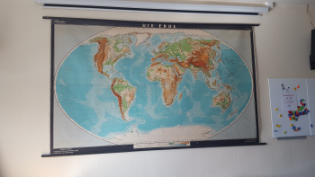 Eine große Weltkarte an der Wand hilft nicht nur bei den Hausaufgaben in Geographie, sondern auch einander zu zeigen, woher man selbst oder die eigenen Eltern nach Deutschland gekommen ist.