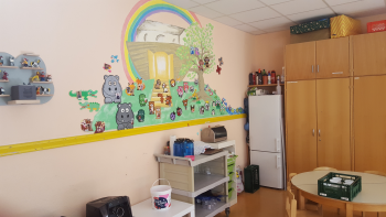 Vorher waren wir noch im Kleinkinderbereich, in dem Kinder von 8 bis 14 Uhr betreut werden, die keinen Kitaplatz haben. Doch es sieht hier aus wie in einer Kita: