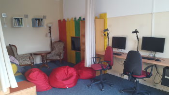 Im Nebenraum links stehen Computer und daneben befindet sich eine super gemütliche Ecke, wo vorgelesen wird. Damit auch alle die Bilder der Bilderbücher sehen können, werden sie vorher eingescannt und dann am Bildschirm vorn für alle in Groß gezeigt.