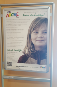 All dies wird durch Spenden finanziert. Hier im Gang ein großer Aufsteller mit einem Dank an die Spender, die wie das Team hier „Kinder stark machen“ wollen.