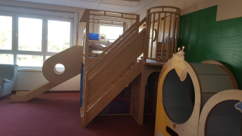 Die „Baustelle“ war früher ein Computerraum und wurde während des Corona-Lockdowns zu einem Spielraum umgestaltet, indem mit Legos u.ä. etwas Schönes gestaltet werden kann.