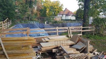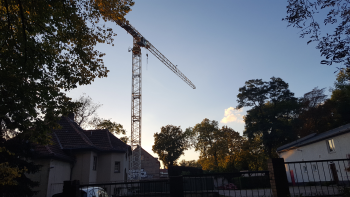 Inzwischen ist es schon dämmrig geworden. Unser Weg führt uns diesmal durch das Tor der Biesdorfer Schlossparks gleich neben der Kita und von dort am Schloss vorbei herunter zu B1. Hoch über den Häusern am Abendhimmel steht der Kran über der Baugrube des neuen Gemeindezentrums! Da müssen wir wohl noch mal wiederkommen.