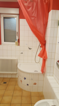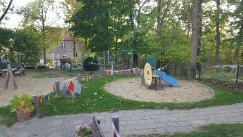 Zuerst besichtigen wir den Spielplatz hinter dem Haus, sehr ruhig und unter hohen Bäumen gelegen.