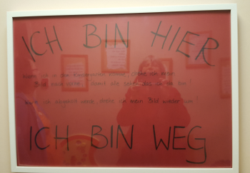 Im Flur hängen unter dieser Schrift die Fotos der Kinder, einmal von vorn und auf der Rückseite von hinten fotografiert. Wenn sie nach Hause gehen, drehen sie das Foto um: Ich bin weg. Und morgens: Ich bin hier: