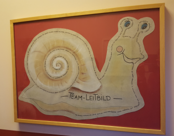 Das Team der Mitarbeitenden hat sich ein Leitbild erarbeitet, dass hier im Schneckenformat für alle nachzulesen ist – so kreativ als Umrandung: statt eines Striches Schrift! Das lädt ein, es auch wirklich zu lesen!