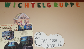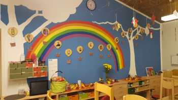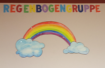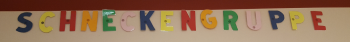 Oben im Flur gibt es für die Eltern Infos zu jeder der drei Gruppen unter diesen farbenfrohen Überschriften.