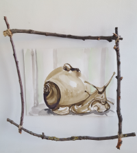 Im Flur in der Nähe des Eingangs fällt dieses Schneckenbild ins Auge. Den Rahmen bilden zusammengebundene Stöcke. Sehr dekorativ!