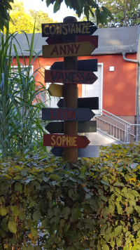Davor steht ein Wegweiser mit Namen von Kindern, die vor Jahren mal zeigten, in welcher Richtung ihr Zuhause liegt.