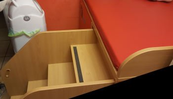 Und wenn es danach zum Wickeltisch geht, dann können sie eine Treppe herausziehen, so dass die Kleinen selbst hochkommen können und Rücken geschont werden!