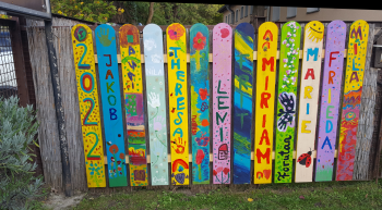 Ins Auge fiel gleich der bunte Zaunabschnitt, wo die künftigen Schulkinder jetzt im Sommer noch ein buntes Andenken an sich hinterlassen haben.