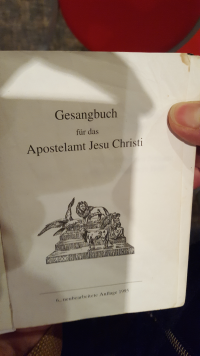 Das Gesangbuch enthält nur die Texte der Lieder. Die Melodie ist den Gemeindeglieder also bekannt. Zu sehen ist das Symbol / das Logo der Kirche, das sich auf einen Vers aus der Offenbarung des Johannes 4,7 bezieht, wo von vier Wesen die Rede ist: von einem Löwen, einem Kalb, einem Adler und einem Menschen, die das vierfache Amt in dieser Kirche darstellen: das Amt des Apostels, des Propheten, des Evangelisten und des Hirten.