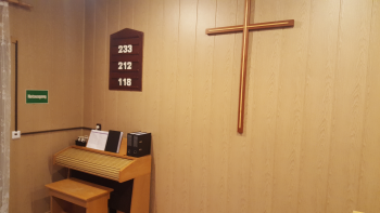 Daneben ein Harmonium und dadrüber die Nummern der Lieder im Gesangbuch, die gesungen wurden.